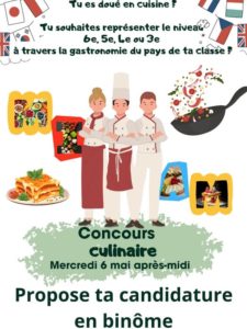 Nous invitons chaleureusement les parents qui le souhaitent à s’associer à cette aventure : en venant témoigner de leurs habitudes culinaires et/ou en accueillant des élèves étrangers. Votre participation rendra ce projet encore plus vivant et enrichissant pour tous.